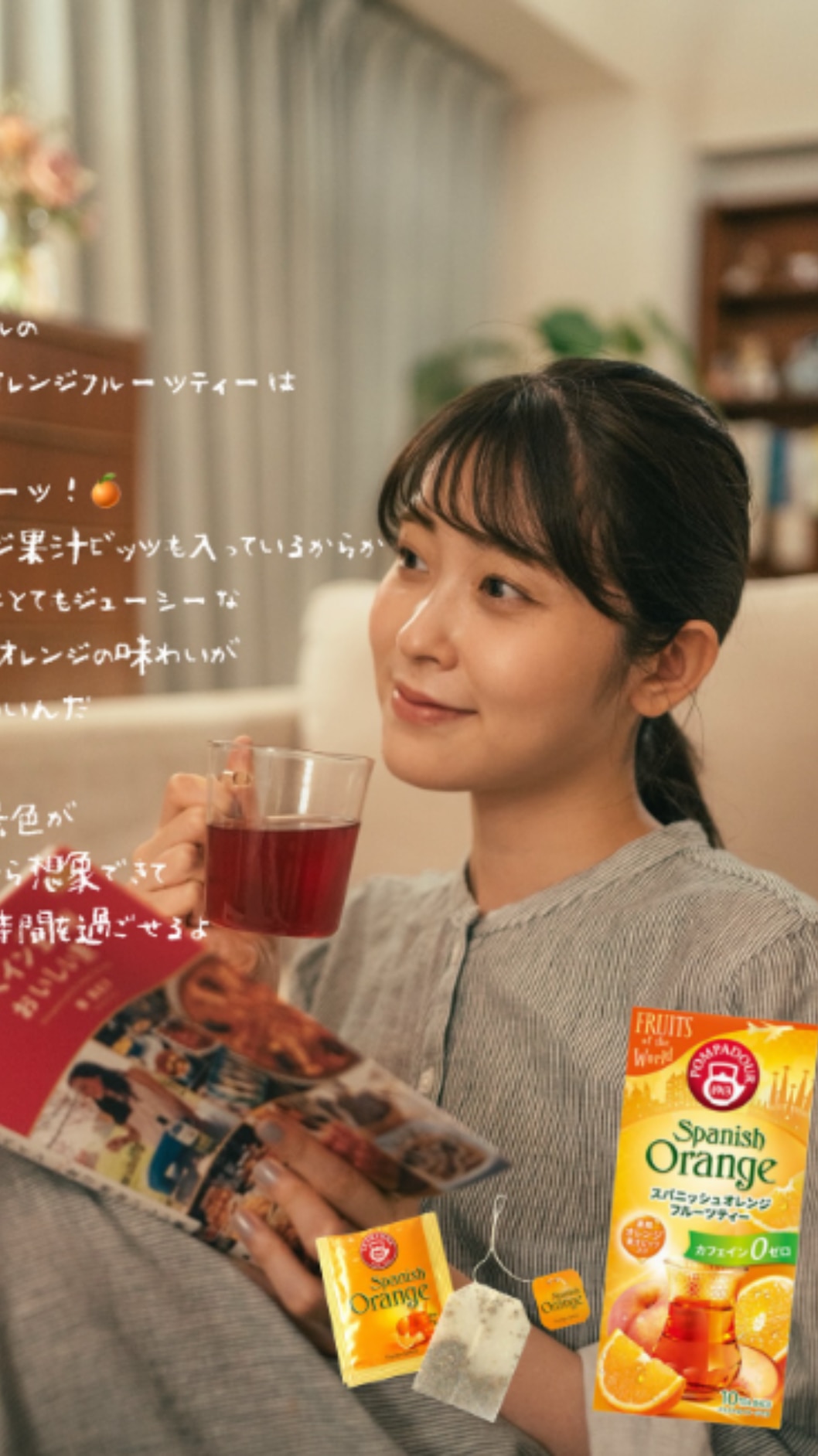 ナチュラル系ファッションのモデルとして活動するゆべしさんを起用し、 フルーツティー「ポンパドール フルーツ オブ ザ ワールド」でおうち時間を楽しむ様子をコンテンツ化。